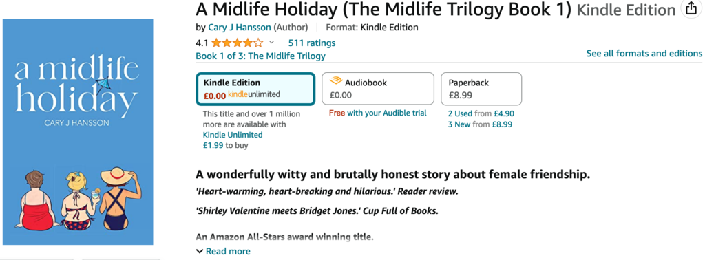 At the time of writing, it’s been almost a year since I published Midlife Holiday. I am close to 5,000 sales, nearly all of which were at full price! I’ve also been selected for Amazon Kindle Deals and even been awarded the All Stars Bonus, which is a monthly bonus for KDP books with the most pages read. And I’ve now had an approach for the screen rights!