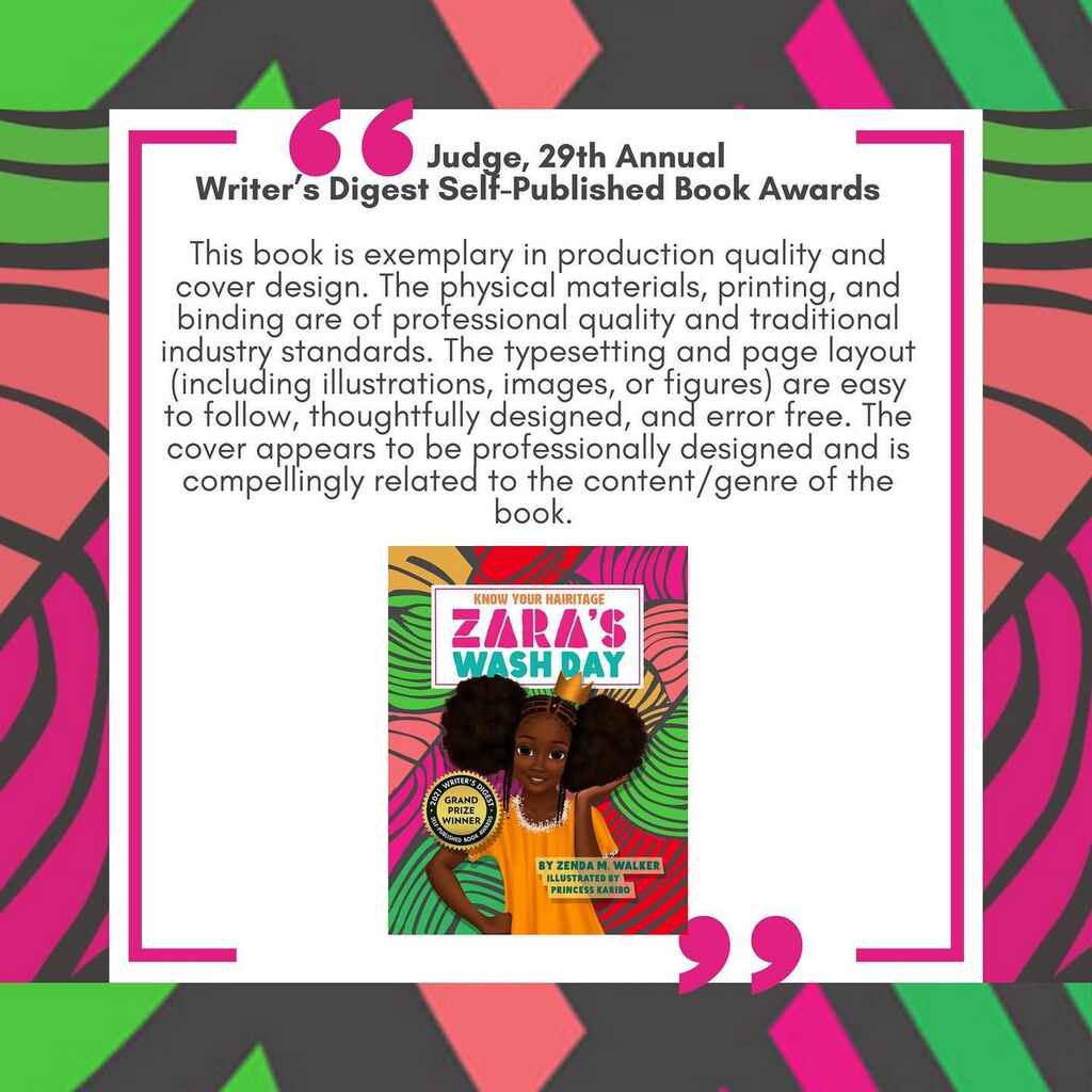 Since its publication, Zara’s Wash Day has won three industry awards (2021 Writer's Digest Self-Published Book Awards, Feathered Quill Book Awards, Literary Titan Book Award) and has been featured in several online and print publications, including Writer’s Digest March 2022 issue and Bostonia Magazine.