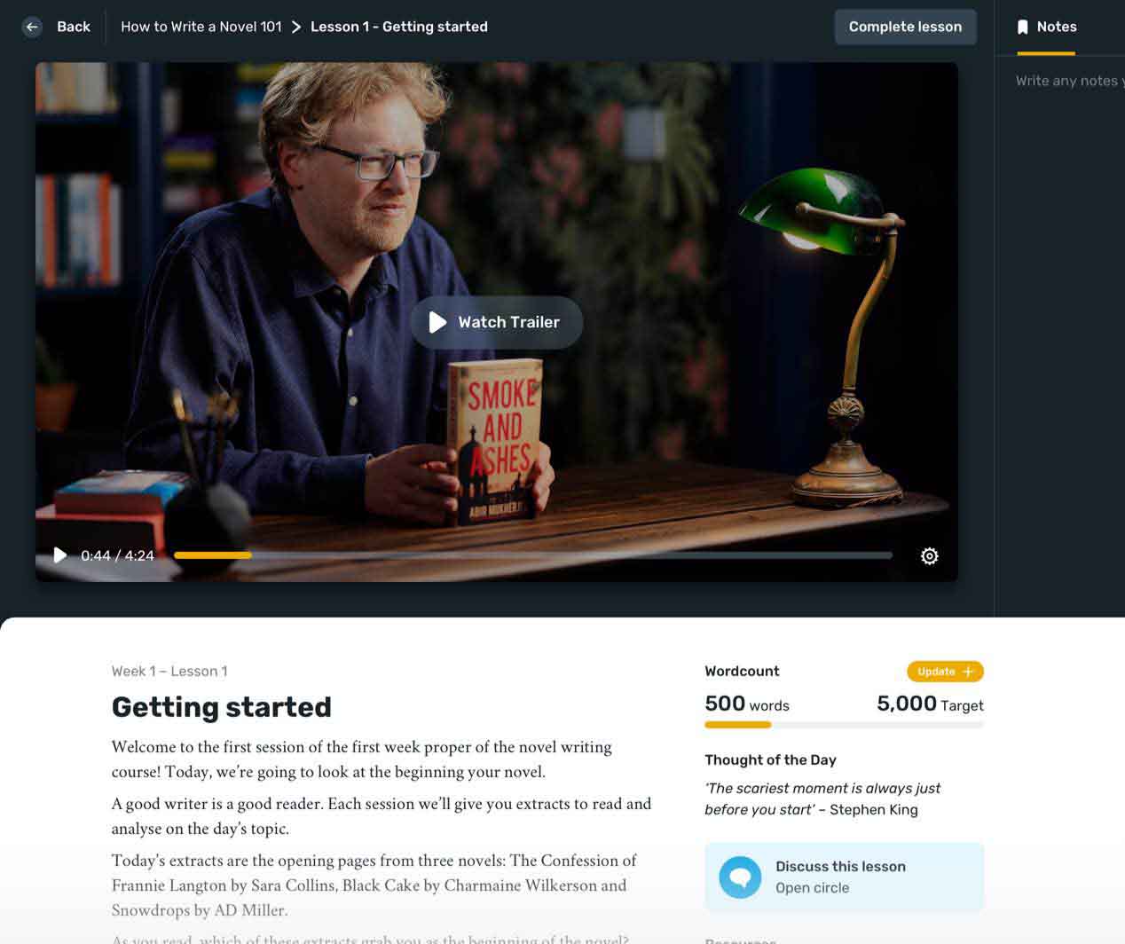 The course gives you time to learn and time to write. The course is taught through a combination of daily video-led lessons, writing exercises, and a vibrant online community where you can discuss your work with other writers. As soon as you sign up, you’ll have access to video lessons to complete on your own timeline. You can also supplement the video lessons with weekly live masterclasses by adding a Learning Membership.